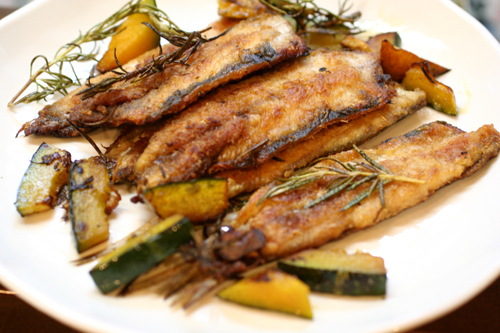 三枚におろしたいわしの両面にクレイジーソルトをふり、小麦粉を両面につけ、オリーブオイルをひいたフライパンで両面こんがり焼いていく。