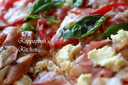 この間やったばかりですが、そのときのピザ生地が残っていたので、今日のランチはピザです。