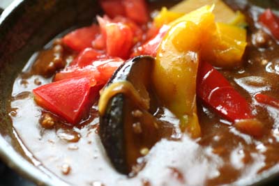 別の器に温かいカレーを入れて、トマト、かぼちゃを盛り付けて出来上がり。