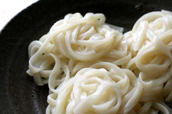 麺が茹で上がったら水で洗い、よく水を切って器に盛ります。