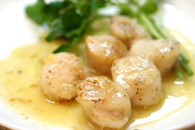 フライパンにオリーブオイルとバターをいれ、熱し、塩・コショウして小麦粉を片面だけつけたホタテを小麦粉の面を下にしてまず、焼き色をつけるように炒めます。