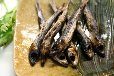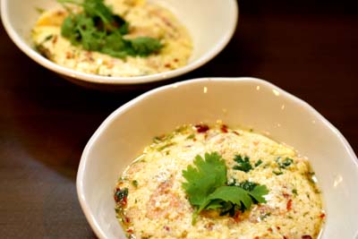 唐辛子をすり鉢で擂っておき、パクチーを茎ごとみじん切りにしたものを加えさらに擂りあわせ、そこにナンプラーとレモンを絞り入れ、ニンニクをつぶしたものを浸して、しばらくなじませておきます。