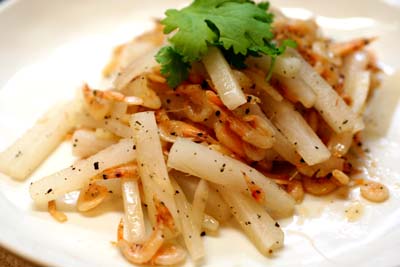 ごま油にみじん切りしたニンニクを炒め、そこに大根と桜海老を入れ、塩・コショウして酒を少々加え、炒めてできあがり。
