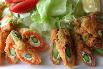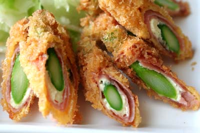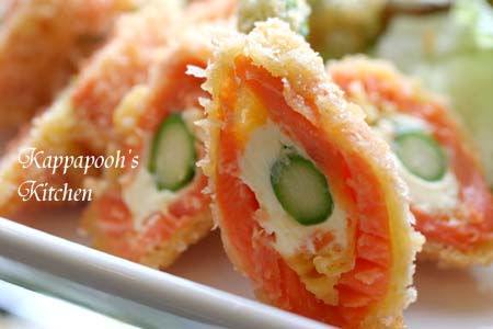 アスパラを半分に切り、クリームチーズをアスパラの真ん中に塗りつけて、スモークサーモンを巻き、