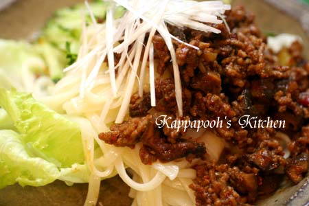 温かい肉味噌をかけて、みゅうり、レタス白髪ネギを添えて出来上がり。