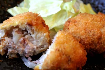小麦粉・溶き玉子・パン粉をつけ、160度に熱した油でじっくりあげます。