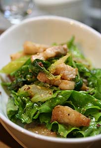 サニーレタスに、脂を含んだ炒め汁をじゅじゅっとかけ、粒マスタードを多めにいれ、混ぜ合わせる。