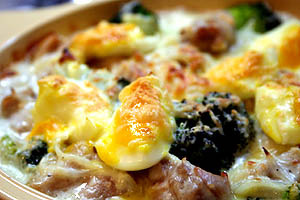 耐熱の器にゆでたブロッコリーを並べ、鶏肉のクリームソース