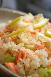 シャケをレンジで加熱してほぐし、ご飯と混ぜ合わせる。オリーブオイル、塩、こしょうを加え、