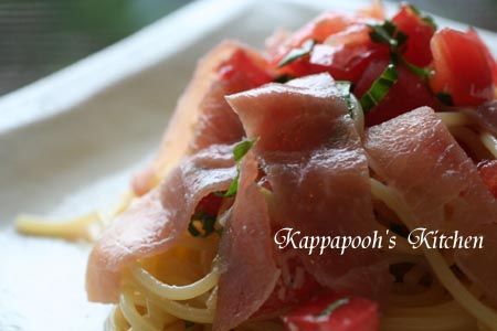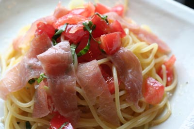 *トマトとバジルの冷製パスタ、生ハムのっけ*
