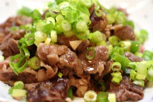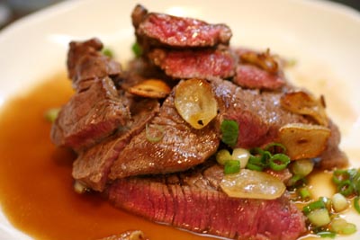 塩・コショウしてレアに焼いて、バターも加えて、にんにくも添えて、ネギとポン酢で。