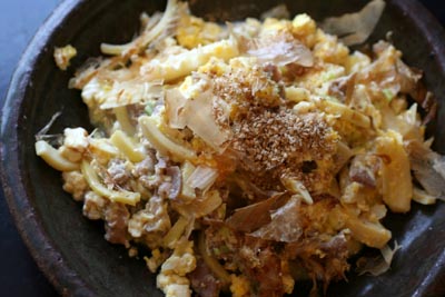 溶き玉子を加えて、ねぎ、かつお節を入れて出来上がり。