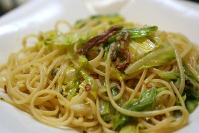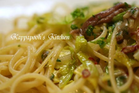 同時に2種類のパスタをやっていたので、出来上がりの見極めが悪くって、キャベツがちょっとしんなりしすぎてしまいました。