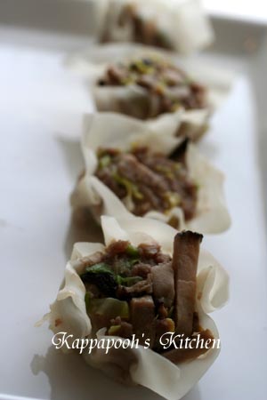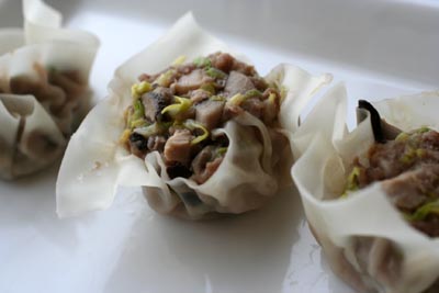 塩、醤油、砂糖を加え、よく混ぜ、シュウマイの皮に包んで蒸す。