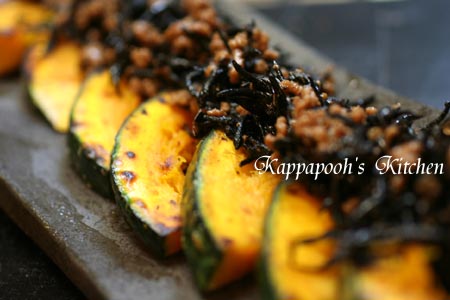 かぼちゃをバターで、両面こんがり焼いてお皿に盛り付け、ひじき肉そぼろをかけて出来上がり。