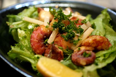 いつもタコを唐揚げにしたりすると固くなるので、今回は肉にやるようにゆでだこを酒と溶き卵でもんで、小麦粉、パルメザンチーズをつけて、油で炒め揚げしました。塩・コショウをして。