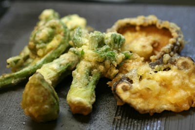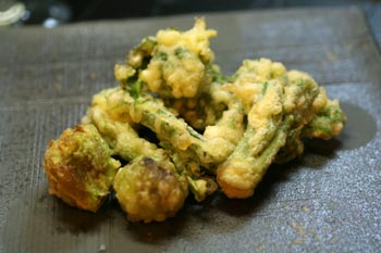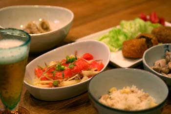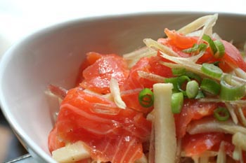 下味をつけたタケノコを細切り、ミョウガは千切りにして、サーモンと合わせ、にんにくを浸しておいたオリーブオイルで和えて塩・コショウで味を調えました。