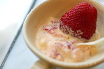 でも、よくあるアイスクリーム屋さんのように冷えた大理石の上で混ぜ混ぜする要領で、お皿の上でイチゴを切って、つぶして混ぜて食べることにしました。