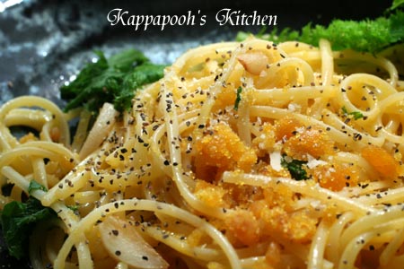 そして、「フライパンにもカラスミが結構着いてるよ~。情報をあげました~。」と私がいうと、「お~!!」とそれもゴムベラできれいに。