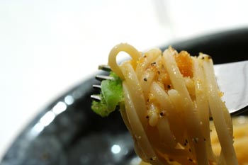 ボールに卵黄とチーズ、生クリームを入れて混ぜておき、そこにカラスミと和えたパスタを入れて手早く絡めて黒コショウをひいてできあがり。