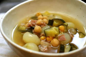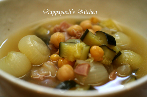 で、ひよこ豆(ガルバンゾー)とズッキーニと合わせてコンソメスープと白ワインでシンプルにスープにしました。