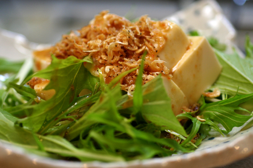 水菜と豆腐にサッと炒めた干しえびをのせて、特製ドレッシングをかけただけです。