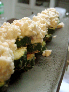 ズッキーニは小麦粉とパルメザンチーズを合わせたものをつけてバターで両面焼きます。