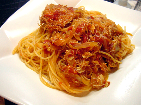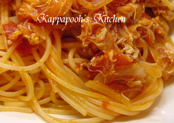 (あ、解説は途中まででしたが、鍋の湯が沸いて塩を入れ、パスタが茹で上がったらもちろんソースと絡めて出来上がりですよ~。)