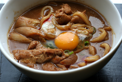 鶏もも肉2~3切れ、ネギ、油揚げを入れて肉に火が通ったら、冷凍うどんを凍ったまま入れて煮込みます。
