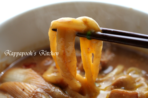 これまでのハマり麺の坦々麺風とは全然違って、ちゃんと味噌煮込みうどんです。