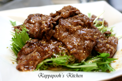 肉に小麦粉を薄くはたいて、フライパンで油を引かずに焼いて、水菜のサラダの上にのせて・・・。
