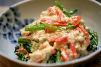 豆腐もキッチンペーパーで包みレンジで加熱して水気を切って、練りごま、砂糖、醤油で簡単に作った白和えです。