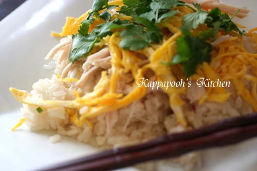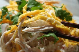 錦糸玉子、鶏肉を混ぜてパクチーの葉を盛り付けてできあがり。