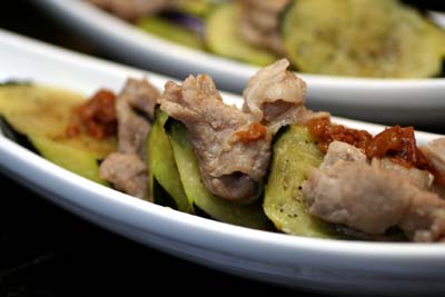 取り出した豚肉と揚げ茄子を、梅をたたいてポン酢と合わせたタレで和えました。