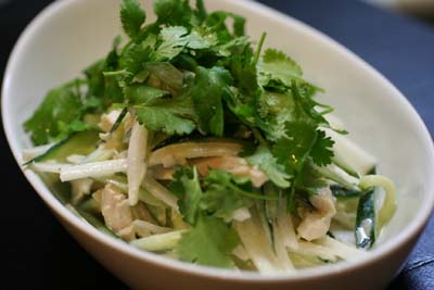 サラダは、生春巻きにしようと切っておいた大根ときゅうりを使って、鶏肉と合わせて、マヨネーズ・ナンプラーで味付けしました。