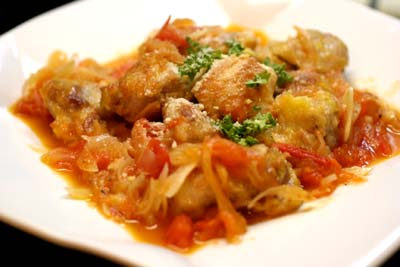 鶏もも肉を適当に切って、酒でよくもんで、とき卵を加えてさらにもみ、片栗粉を入れてよく混ぜ、オリーブオイルをひいたフライパンで焼き色をつけて、塩・コショウし、トマトソースに加え入れます。
