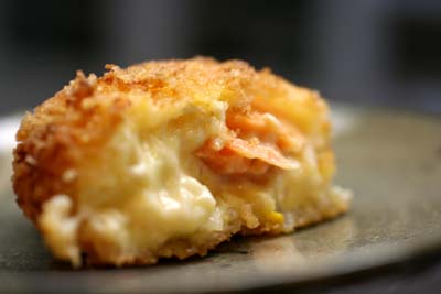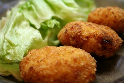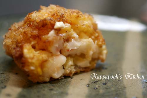 最初卵もつけてましたが、ベシャメルソースが冷やし足らなくってどうやってもだらっと形が崩れてしまい、卵抜きで小麦粉をつけた後づぐパン粉でもちゃんとキレイに揚がりました。