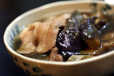 揚げなすをだし・酒・砂糖・醤油で煮たものです。豚肉も入れて。