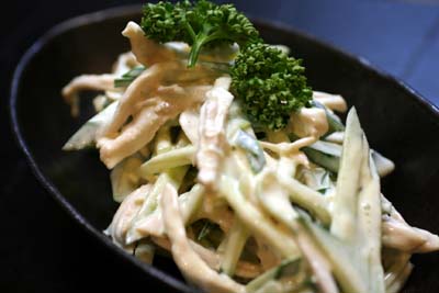ぷーのために用意していた鶏胸肉を酒をふってレンジで加熱して、きゅうりとサラダにしました。
