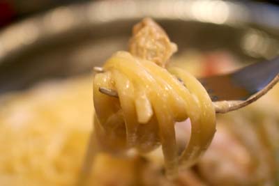 あちゃ~!でもその後ソースの中に入れて絡めて、盛り付けるまでに大人数分ということもあって時間がかかり、どうやらちょうど良かったようです。