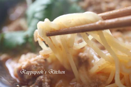 茹でた麺のお湯をよく切って、器に盛り、スープと具を入れて、白髪葱、パクチーを添えて出来上がり。