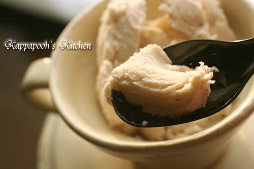 3.生クリームを残りの砂糖を加えて角が立つまで泡立てて2に加えます。ふんわりと混ぜて冷凍庫で冷やし固めます。