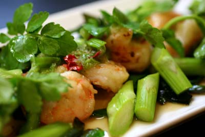 海老とニラとアスパラを盛り付けてソースをかけてパクチーをたっぷり盛り付けていただきます。