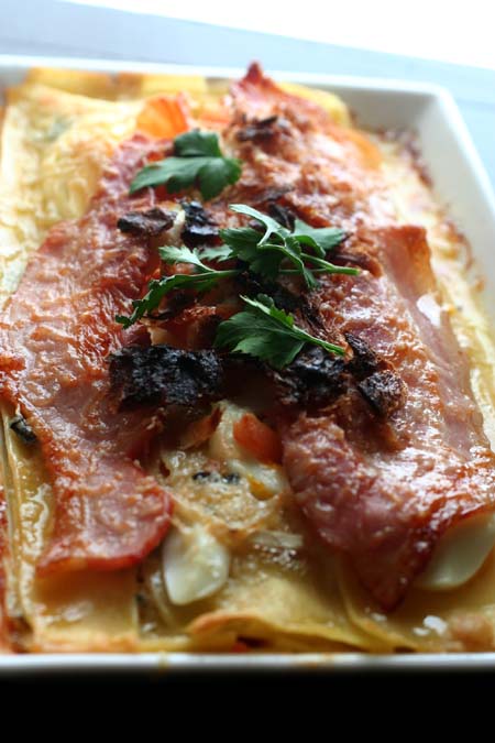 最後にベーコンを重ねて、パルミジャーノチーズをすりおろして、オーブントースターで焦げ目をつけて出来上がり。