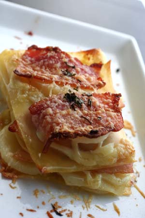 チーズソースが足りなくって残り一枚のラザニアがあったので、それはジャガイモをレンジで加熱して、マヨネーズ、パルメザンチーズ、ベーコンで層にしてまたまたオーブントースターで焼き色をつけます。