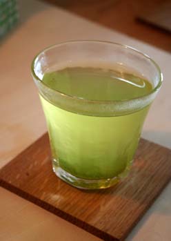 これは温かいお茶ですが、私がこれで飲みたいと厚いグラスを選んで、これでいただきました。