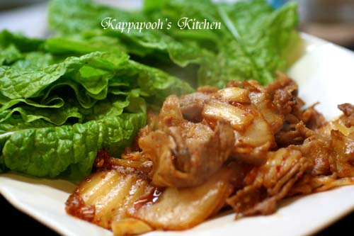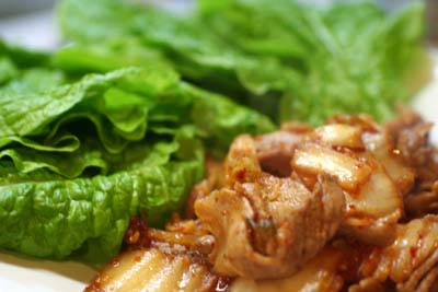 豚肉とキムチをニンニクで炒めて焼肉のタレで絡めて、サンチュ・コチジャンを添えて。