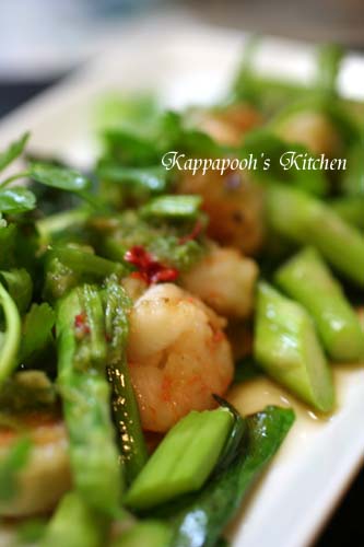 海老とニラとアスパラを盛り付けてソースをかけてパクチーをたっぷり盛り付けていただきます。