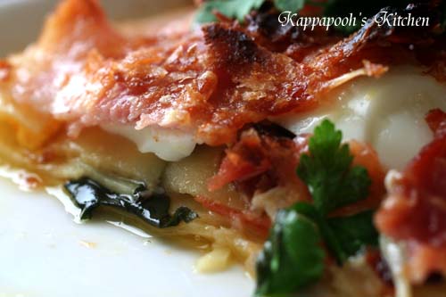 最後にベーコンを重ねて、パルミジャーノチーズをすりおろして、オーブントースターで焦げ目をつけて出来上がり。