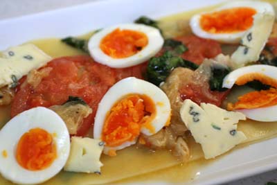 ラザニア・チーズソース・トマト・ブルーチーズ・ゆで卵を重ねていきます。